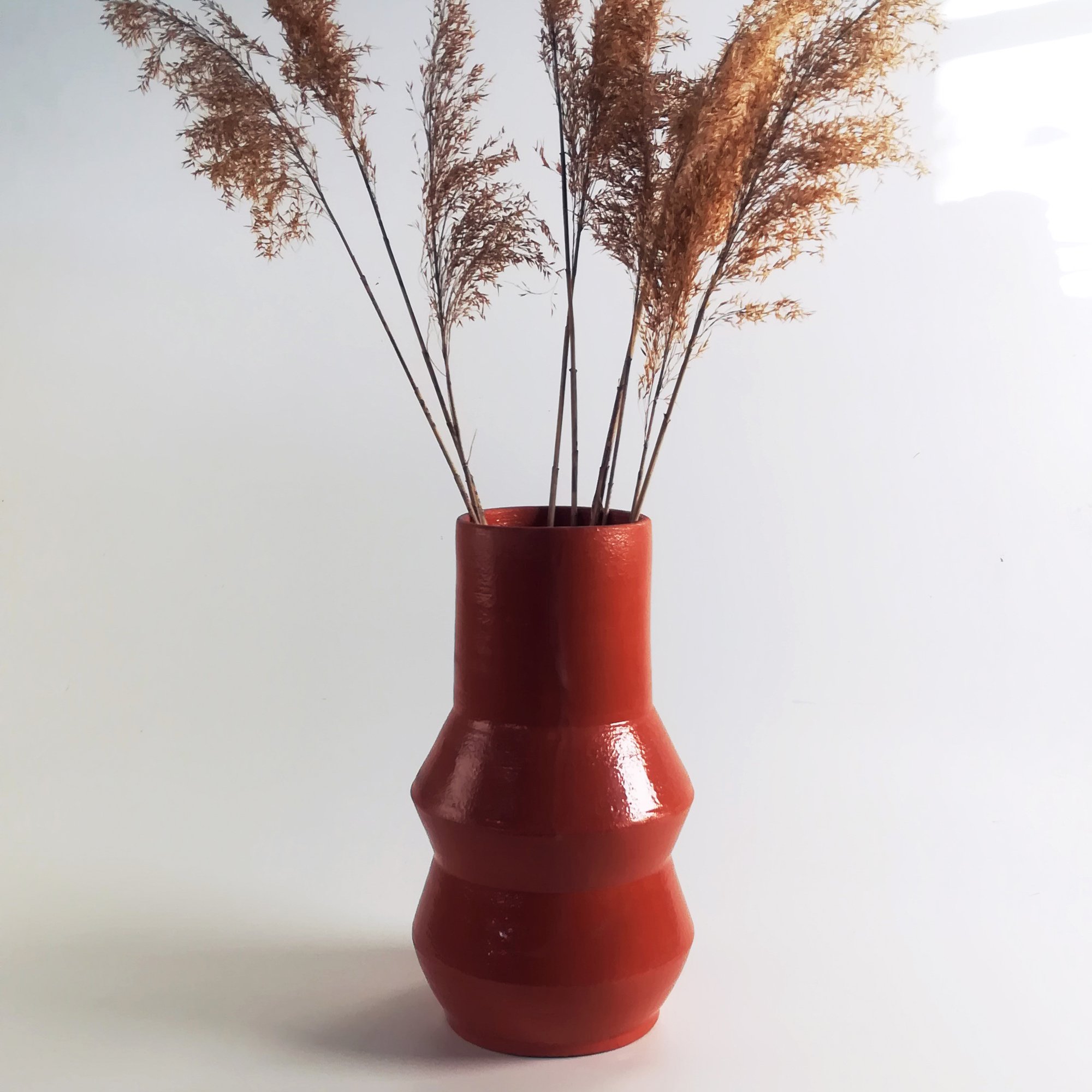 Large terracotta vase with a very geometric shape can brighten your place. It is made from red terracotta. The clay is fired to low range so this vase is meant for dry flowers.
